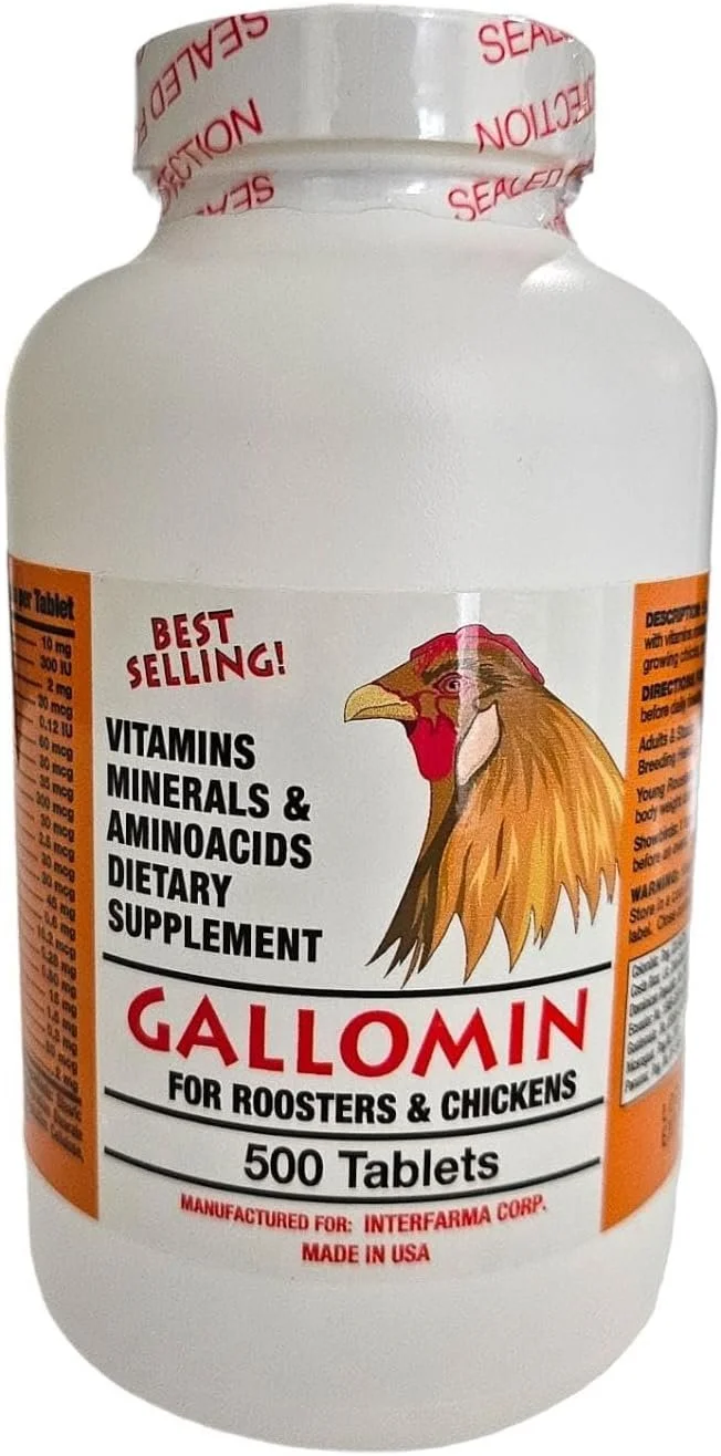 Gallomin is a vitamin and mineral supplement commonly used for poultry, including roosters and chickens. It is formulated to support overall health, improve growth rates, enhance egg production, and boost immunity.